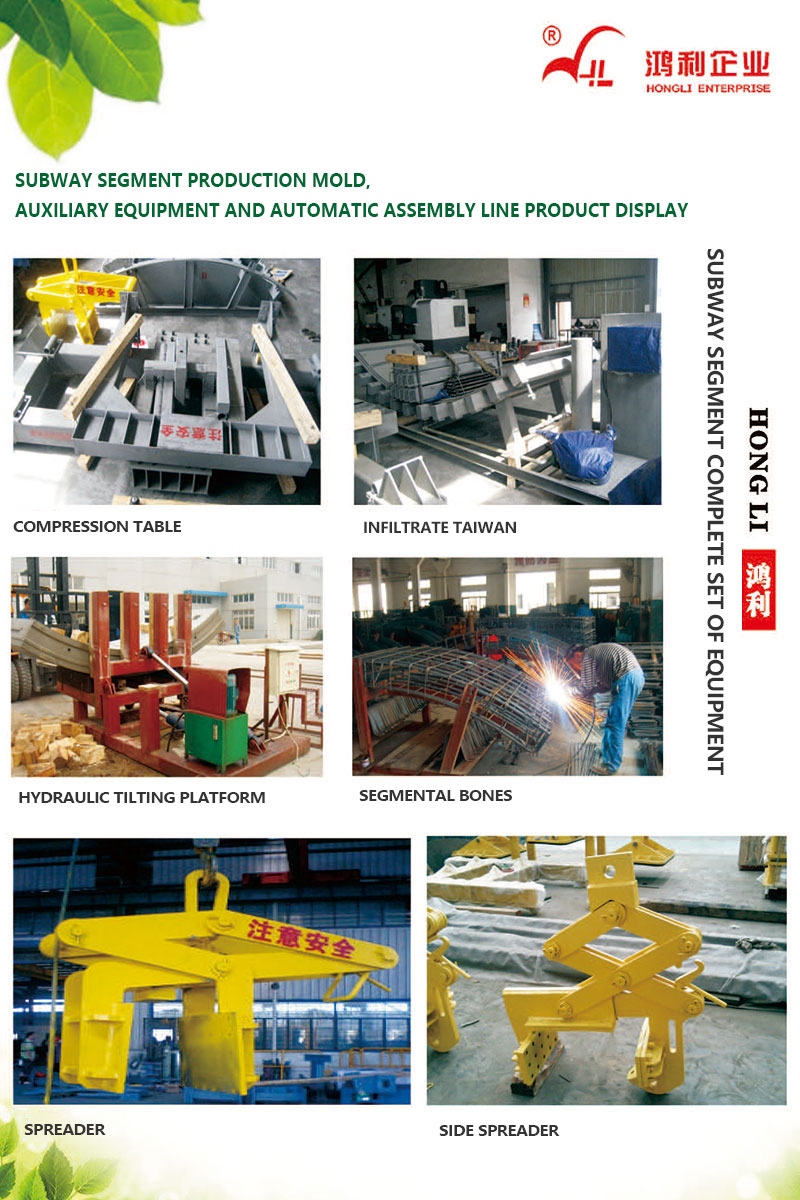 This project has been developed by itself. The project uses PLC control technology, field bus technology, sensor technology and other advanced automatic control technologies to achieve the requirements of shield segment production automation. At the same time, the project adopts: the hydraulic one-way transmission mode is adopted for the traveling device to ensure the smooth operation of the mold car on the assembly line; the top of the hydraulic one-way transmission is equipped with a one-way thrust trolley, which pushes the mold trolley to run forward through the hydraulic cylinder; The self-developed airbag vibration isolation platform or multi-wheeled overhead platform is set up in the vibration room, so as to avoid the energy loss caused by the transmission of energy to the ground during vibration, and reduce the damage to the mold wheel bearing. At the same time, the forming accuracy of the segment is guaranteed to the greatest extent; the end segment handling unit is equipped with a mechanical self-clamping horizontal spreader, which is safe and reliable. Combined with the self-developed mechanical segment turning platform (using worm gear reducer and rack-and-pinion transmission mechanism), it is more efficient and reliable than the traditional turning platform, so that the segment is in a vertical state, and then the self-designed lateral spreader is used. The segment is stably hoisted to the self-developed rail flatbed car, which is combined with frequency conversion technology and wire rope traction, and has the characteristics of stable running and long service life. A complete set of testing equipment such as impermeability test bench, bending and pull-out test bench, and three-ring assembly bench are also set up outside the site.